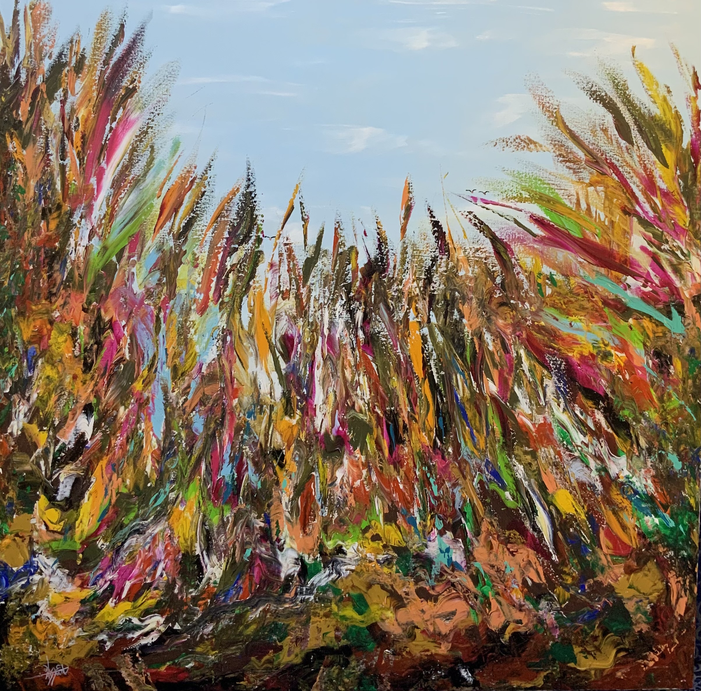 An abstract painting capturing a magical sunset over a vibrant field. The lower half bursts with multicolored brushstrokes—greens, oranges, purples, blues—suggesting wild grasses or tall vegetation in motion. Above, the sky transitions from deep blue to radiant yellow and orange, glowing with the final light of day. The contrast between the lively earth and the fiery sky creates an emotional and contemplative energy.