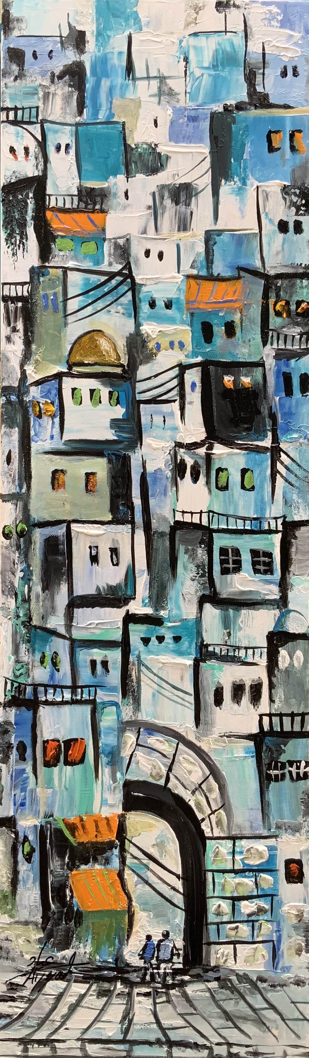 A vibrant painting that captures the spirit of old cities, where stacked houses resemble layered memories. Shades of blue intertwine with warm accents to tell stories of the people who once lived there. The archway at the bottom is more than an entrance—it symbolizes a passage between past and present, reality and imagination.