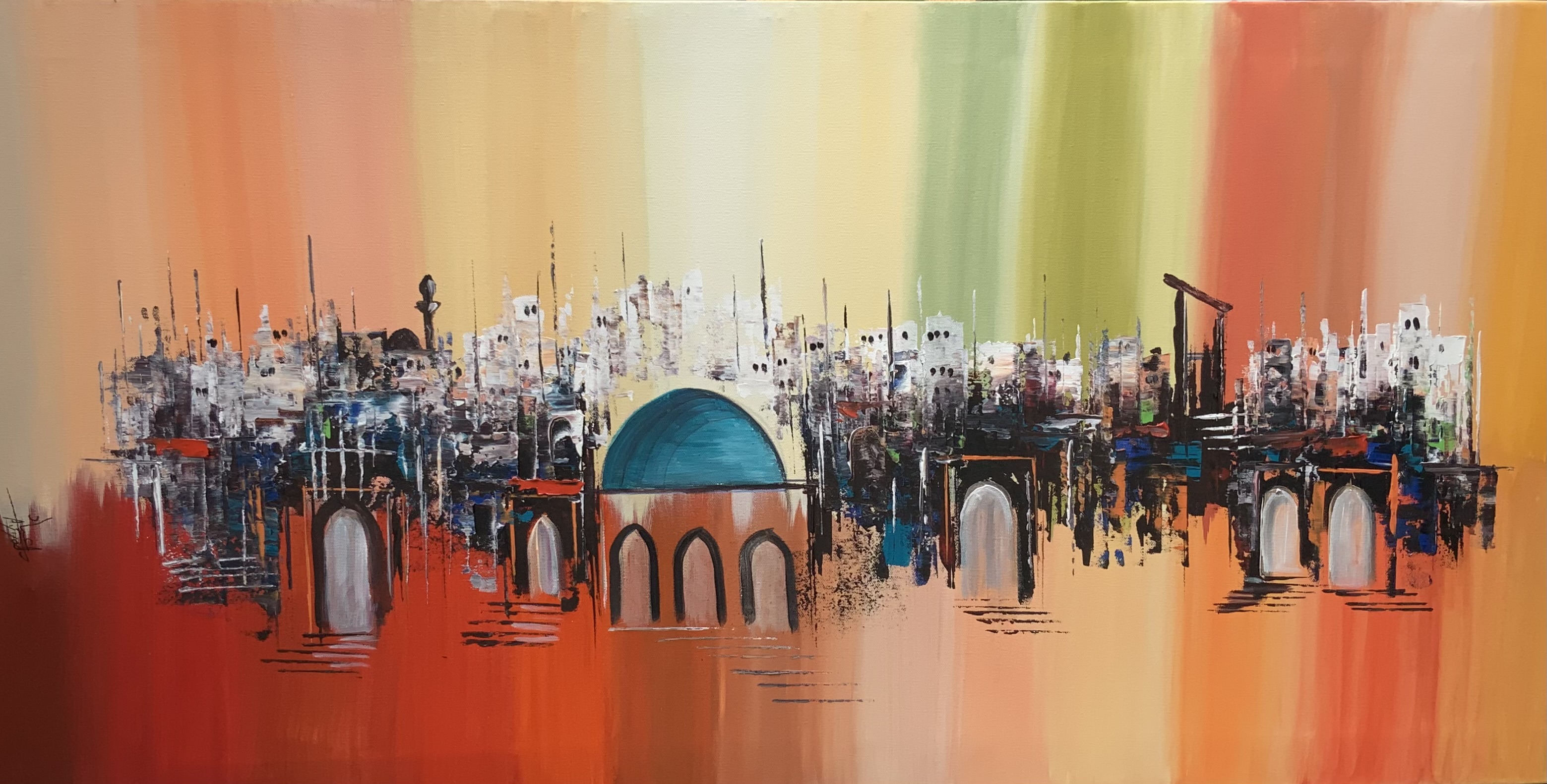 An expressive abstract painting that captures a vibrant cityscape blending traditional and modern architecture. Arches and domes emerge through a warm, gradient background, reflecting movement and urban energy. The turquoise dome acts as a visual anchor, bringing calm amidst the city’s dynamic rhythm.