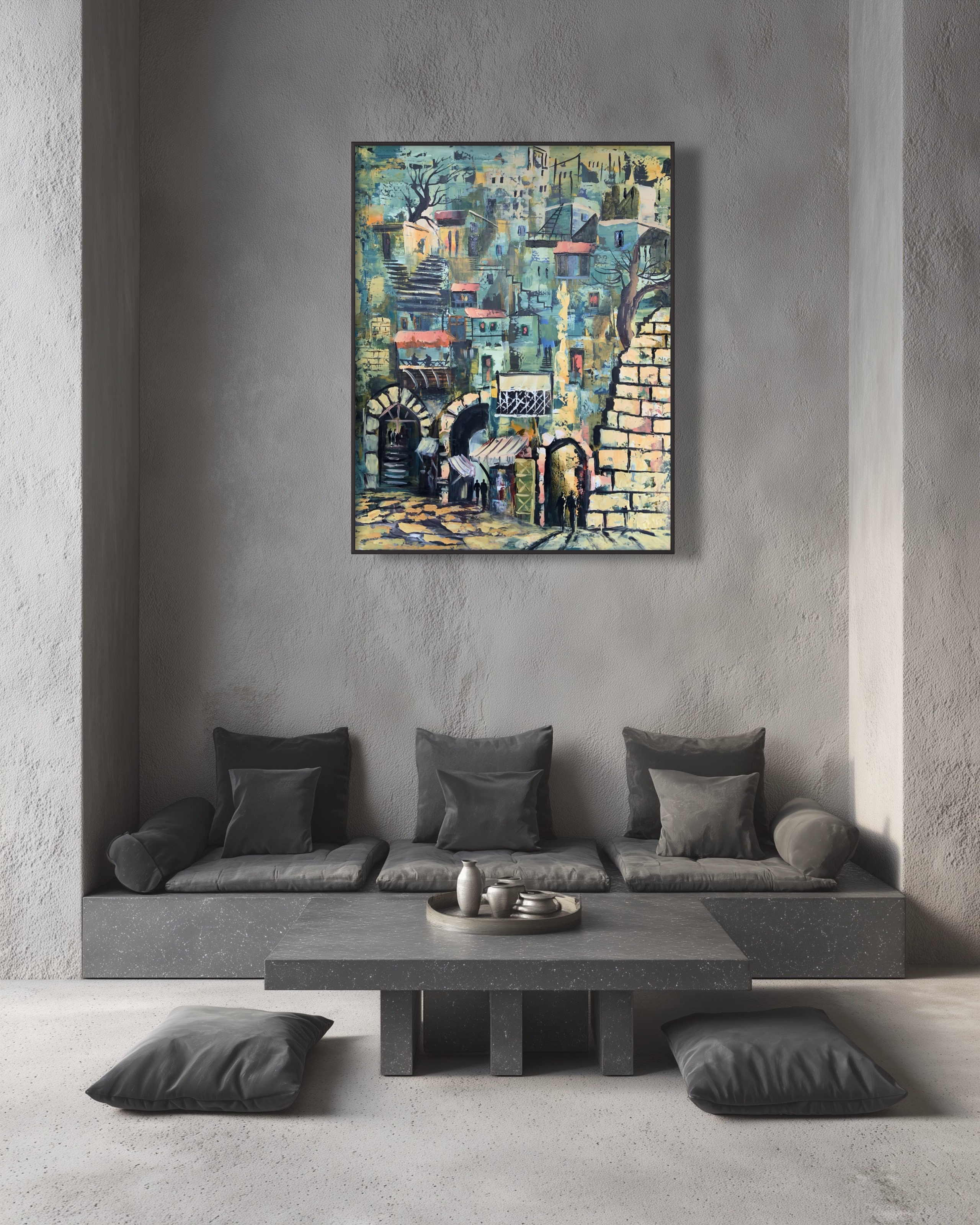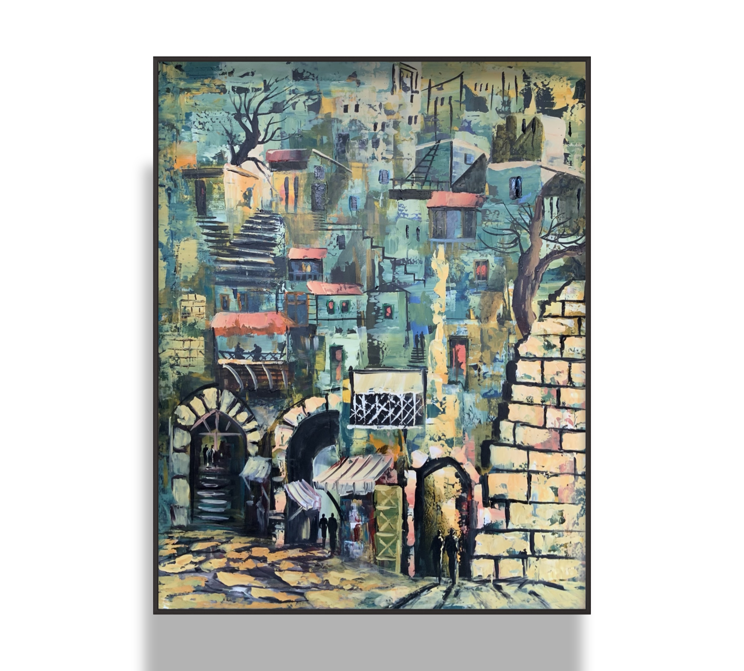 This painting portrays an old city filled with layered stories, where stone alleys and clustered houses merge into a rich abstract composition. The palette of blues, greens, and golden hues evokes nostalgia and the passage of time, while subtle shadows and small figures suggest a quiet, hidden life moving through the scene, as if the city itself is breathing its memories.
