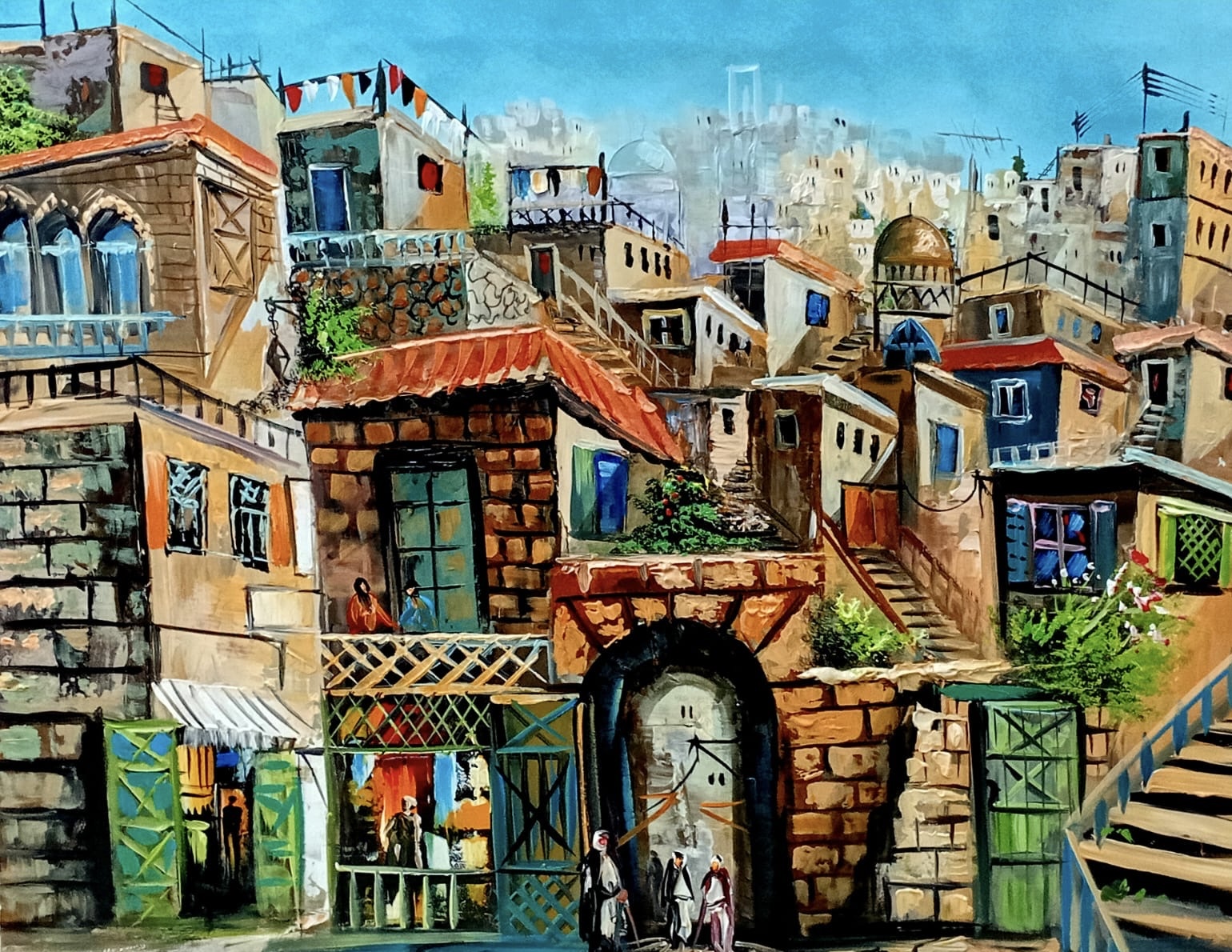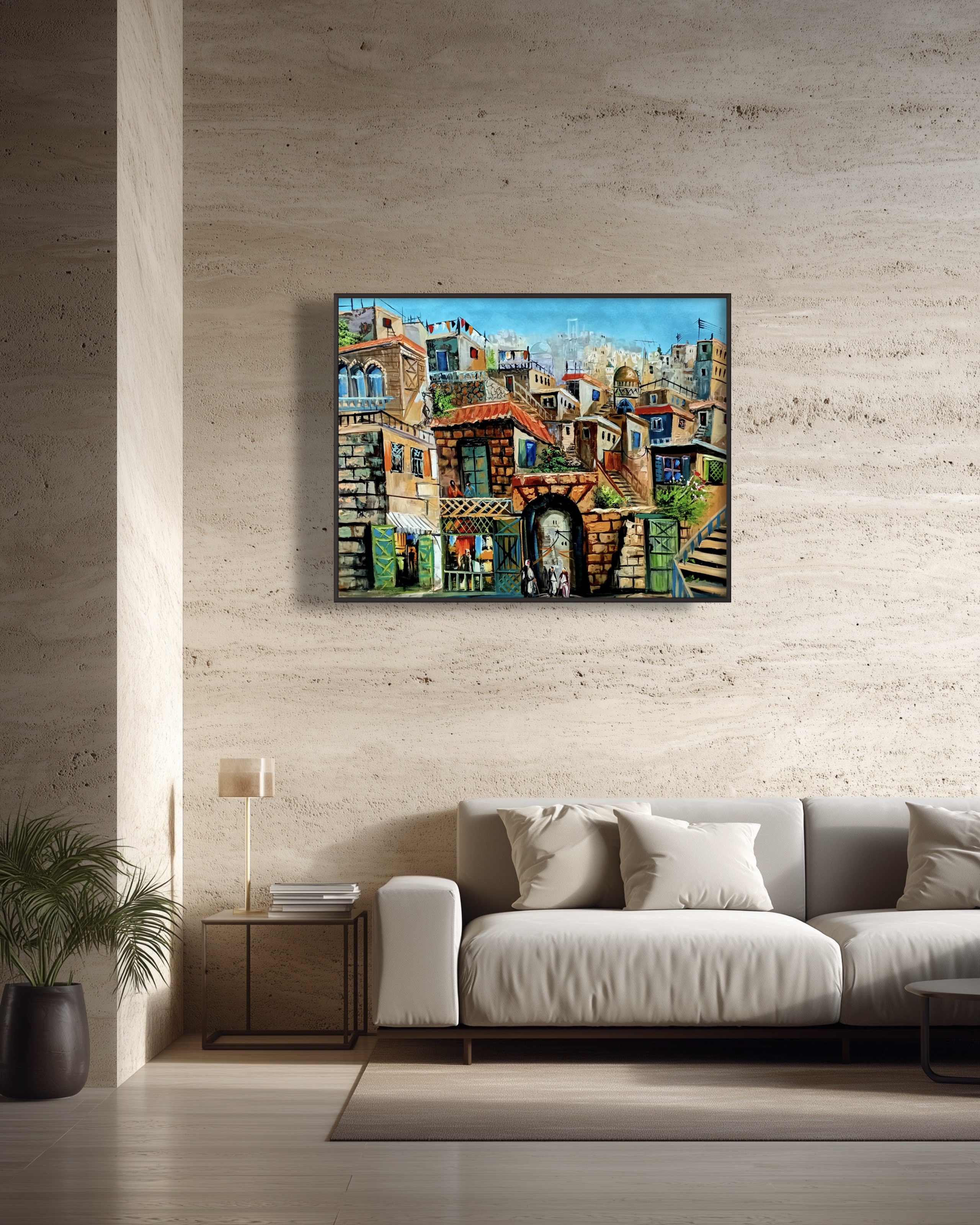 A painting that transports you into the heart of Amman, where houses stack along the hills, telling the stories of their people. The clear details make you feel as if you’re walking through the alleys, noticing balconies and glimpsing everyday life. Layered colors bring warmth, while human presence adds a genuine pulse that makes the city feel alive within the artwork.