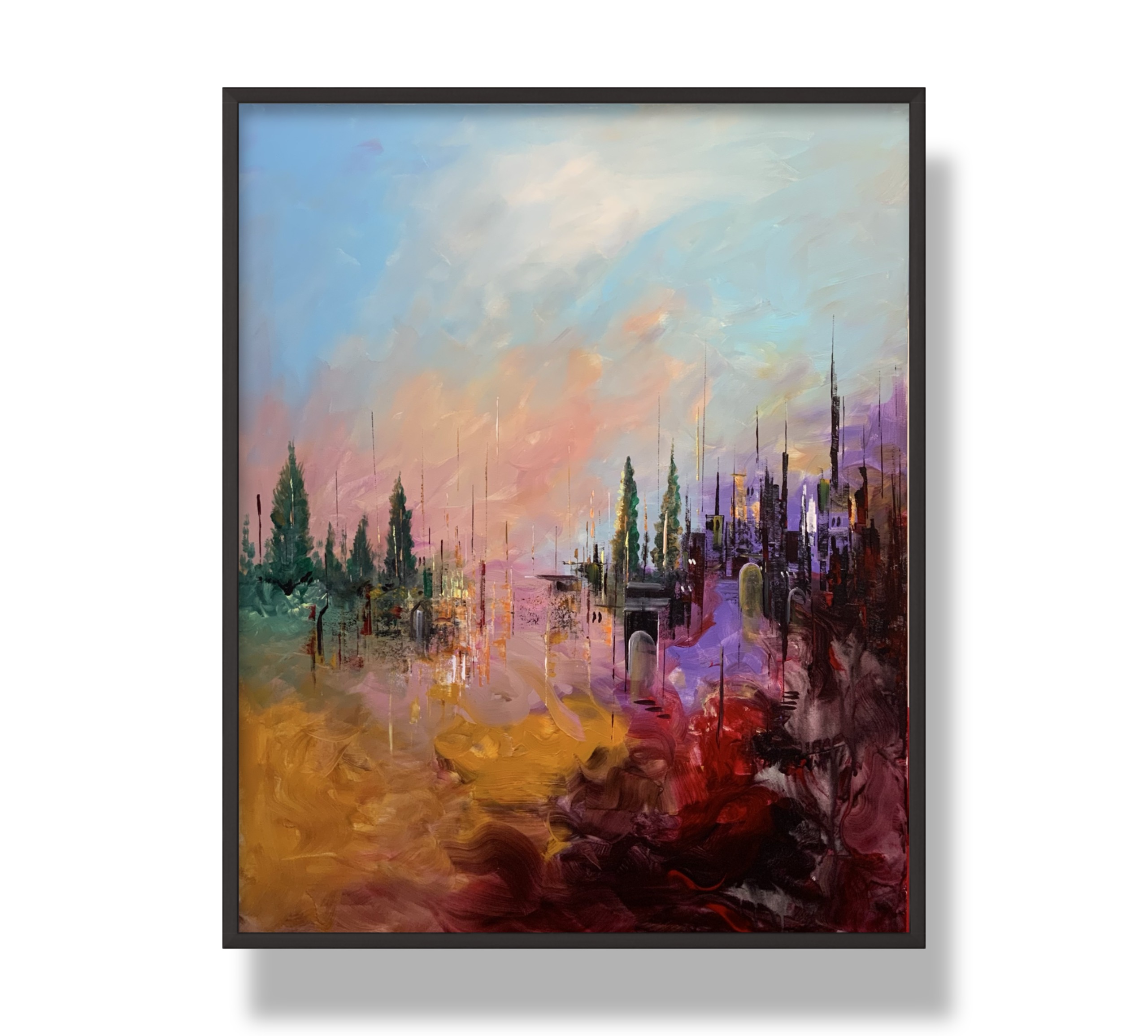 This painting portrays a dreamlike city reflected upon a calm water surface, where architecture and nature merge in a harmonious flow of color. The sky shifts between soft blues and warm pinks, while vertical brushstrokes fall like streams of light, creating a serene yet imaginative atmosphere.