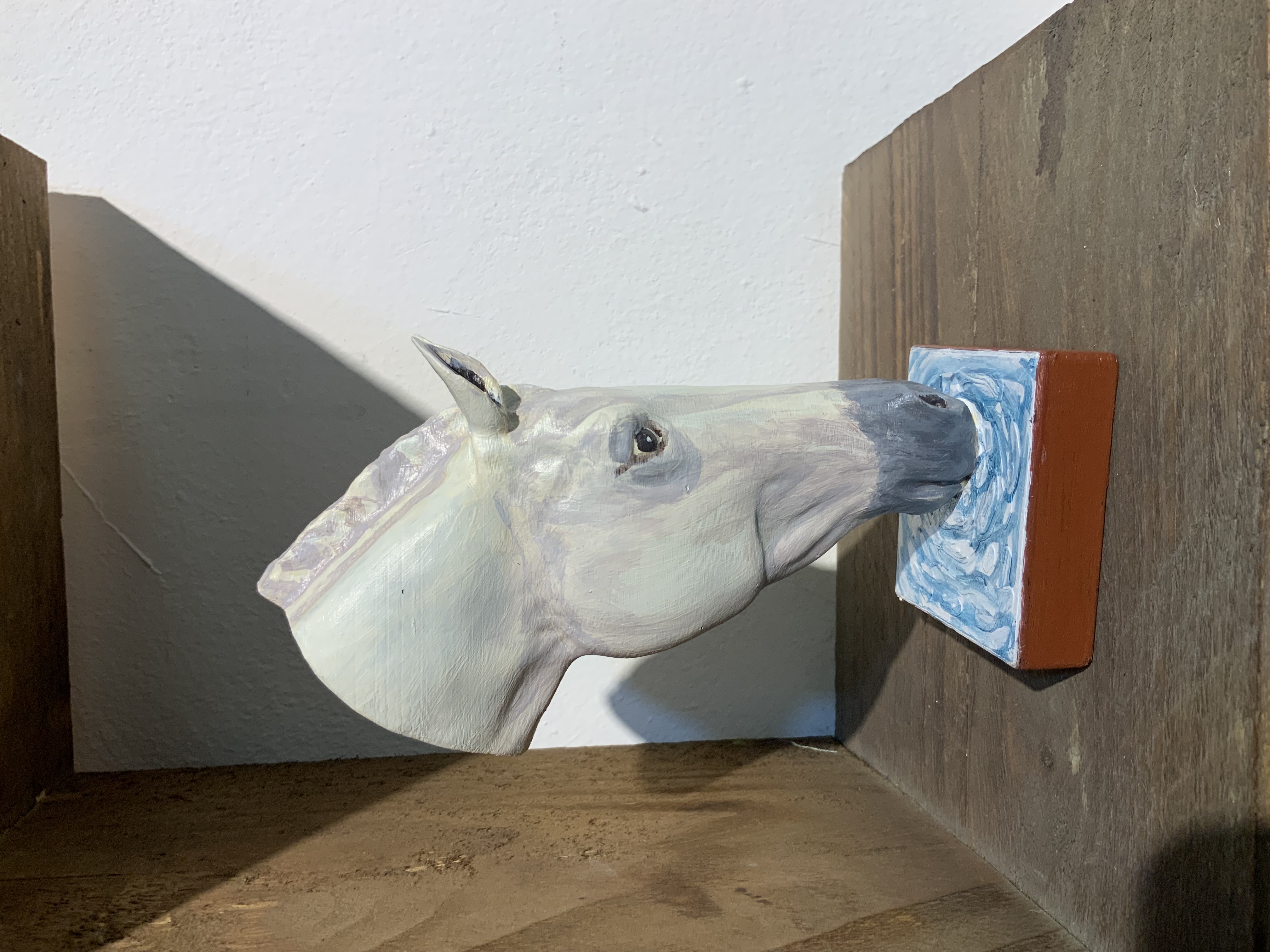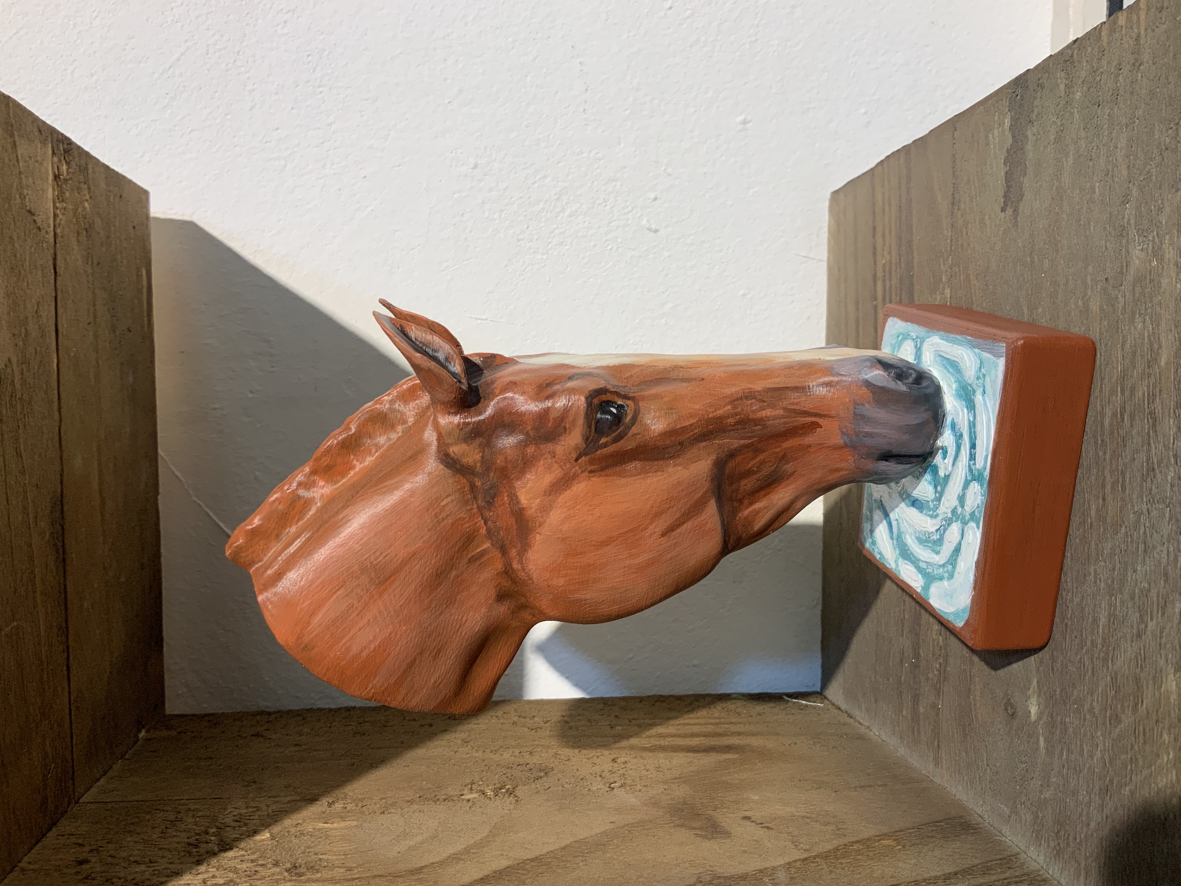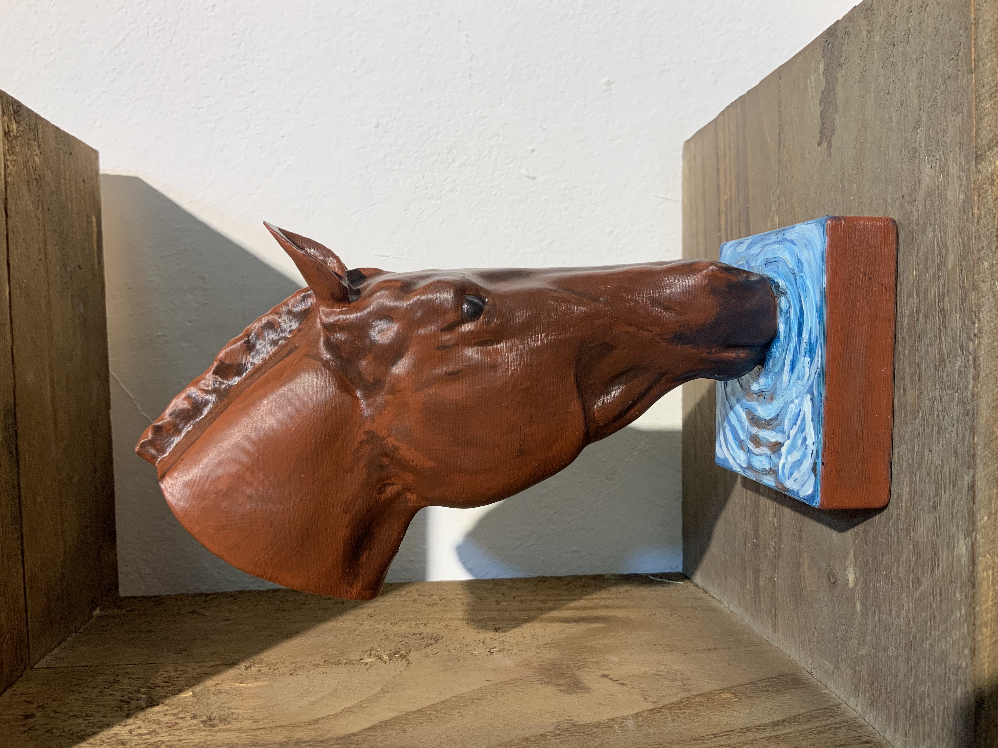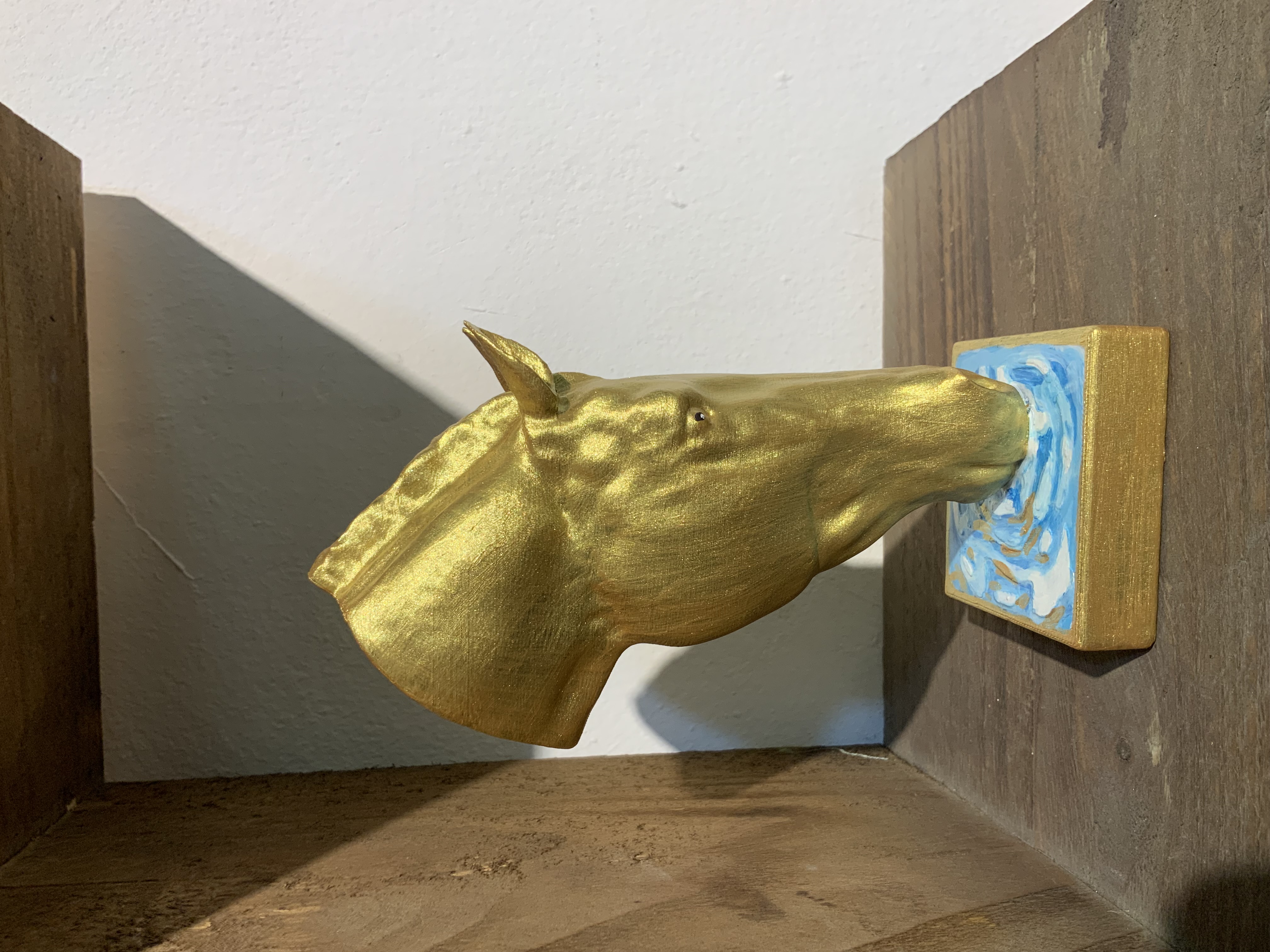 An artistic figurine capturing a poetic moment of an Arabian horse bending to drink water, symbolizing purity and harmony with nature. The piece reflects the elegance and grace of the Arabian breed.