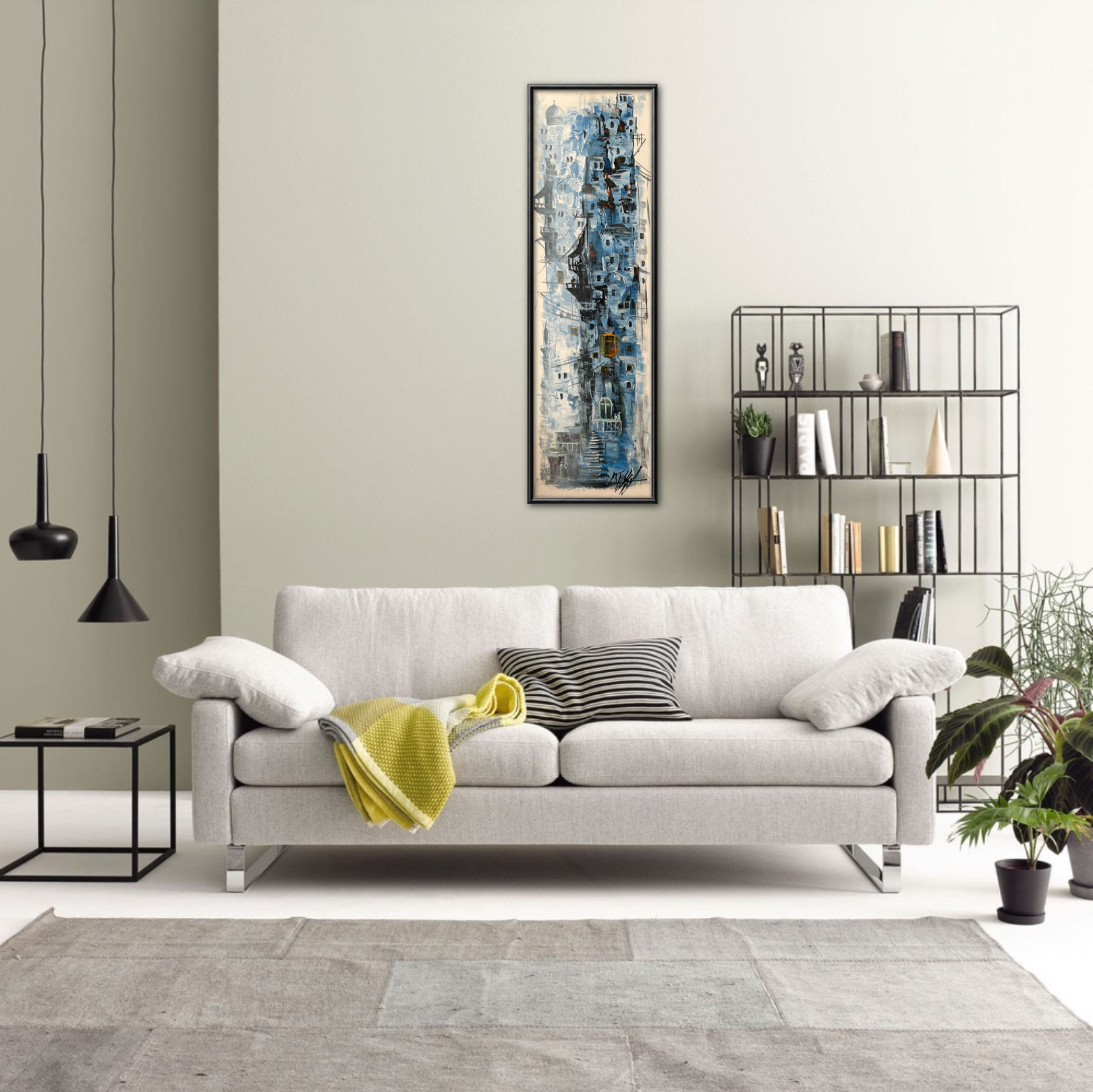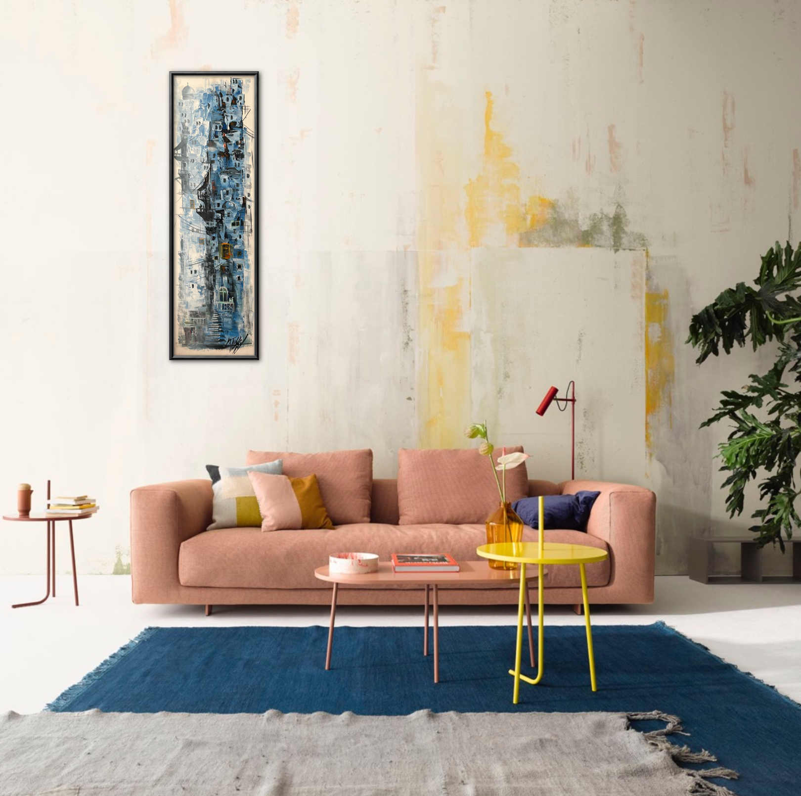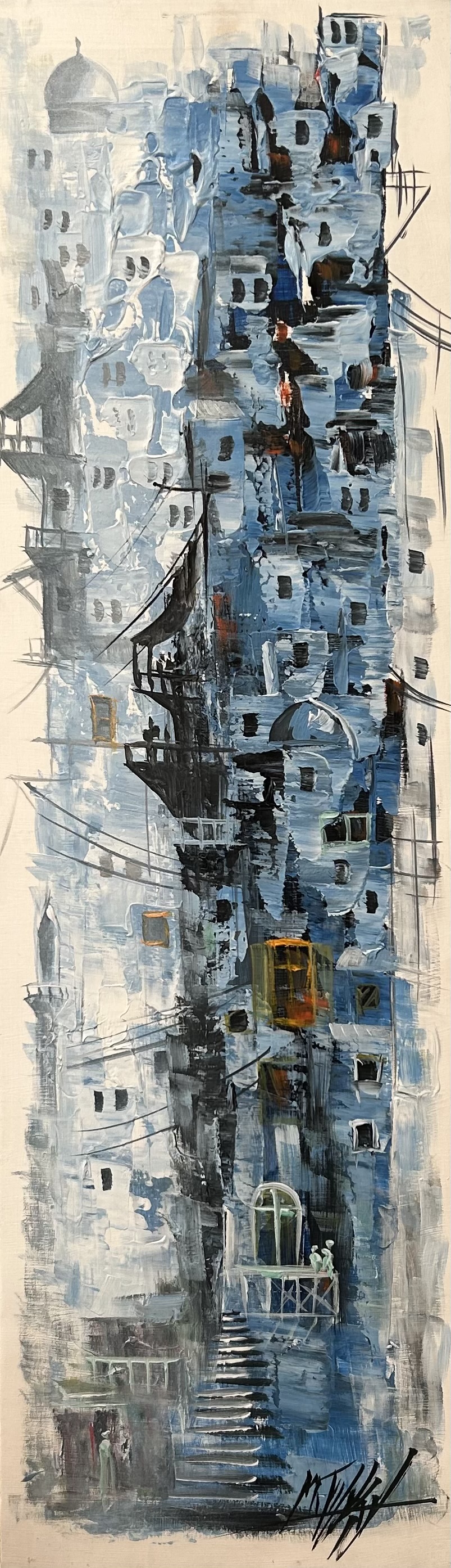 The painting “The Splendor of ammani Houses” captures the charm of traditional Omani houses in deep blue, highlighting the detailed roofs and windows that tell the story of the place. The colors harmonize beautifully, creating a sense of depth and movement, offering viewers a rich and lively visual experience.