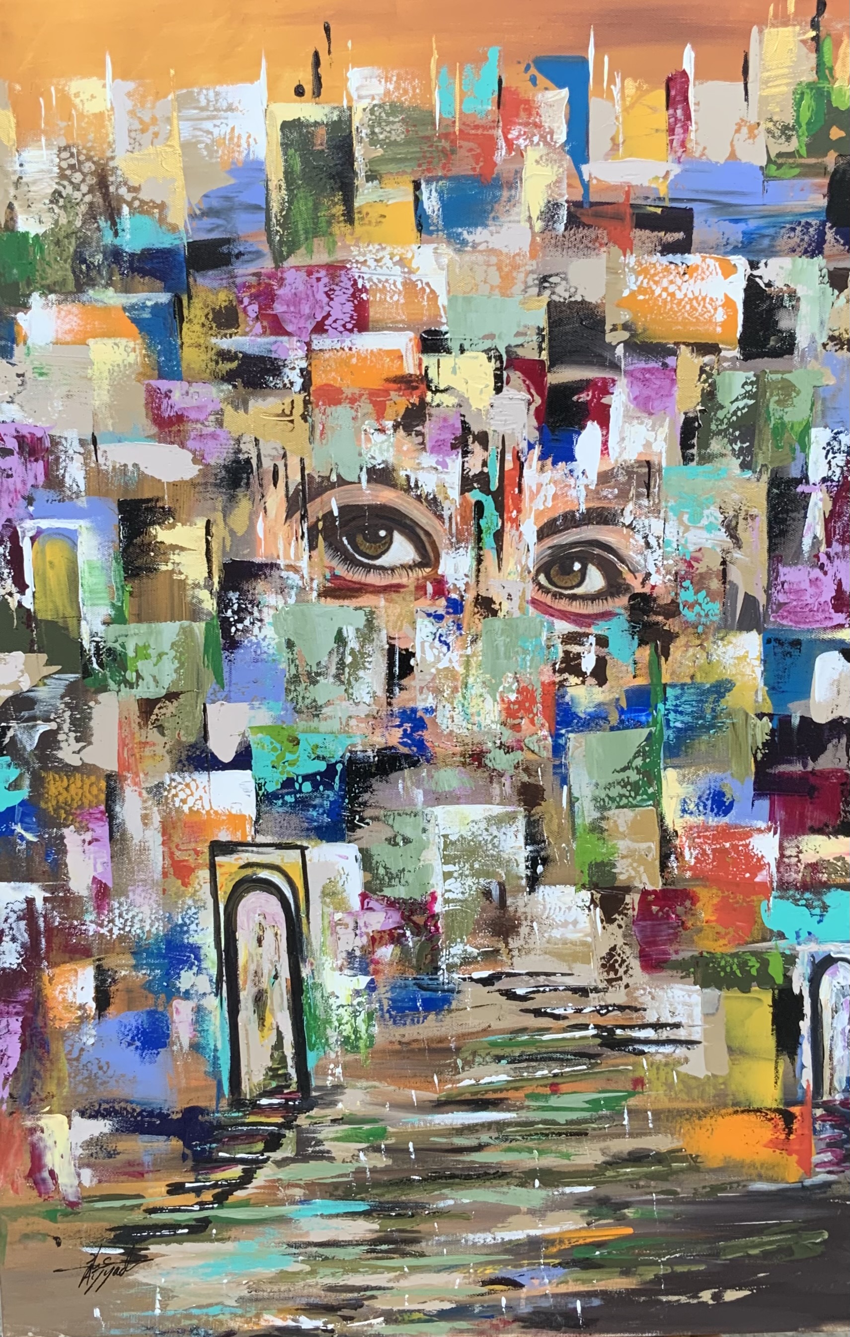 In this painting, human beauty meets the soul of the city. The girl’s hazel eyes reflect the spirit of the urban landscape below, painted in warm earthy and green tones. The composition merges reality and dream, symbolizing the emotional bond between a person and their city.