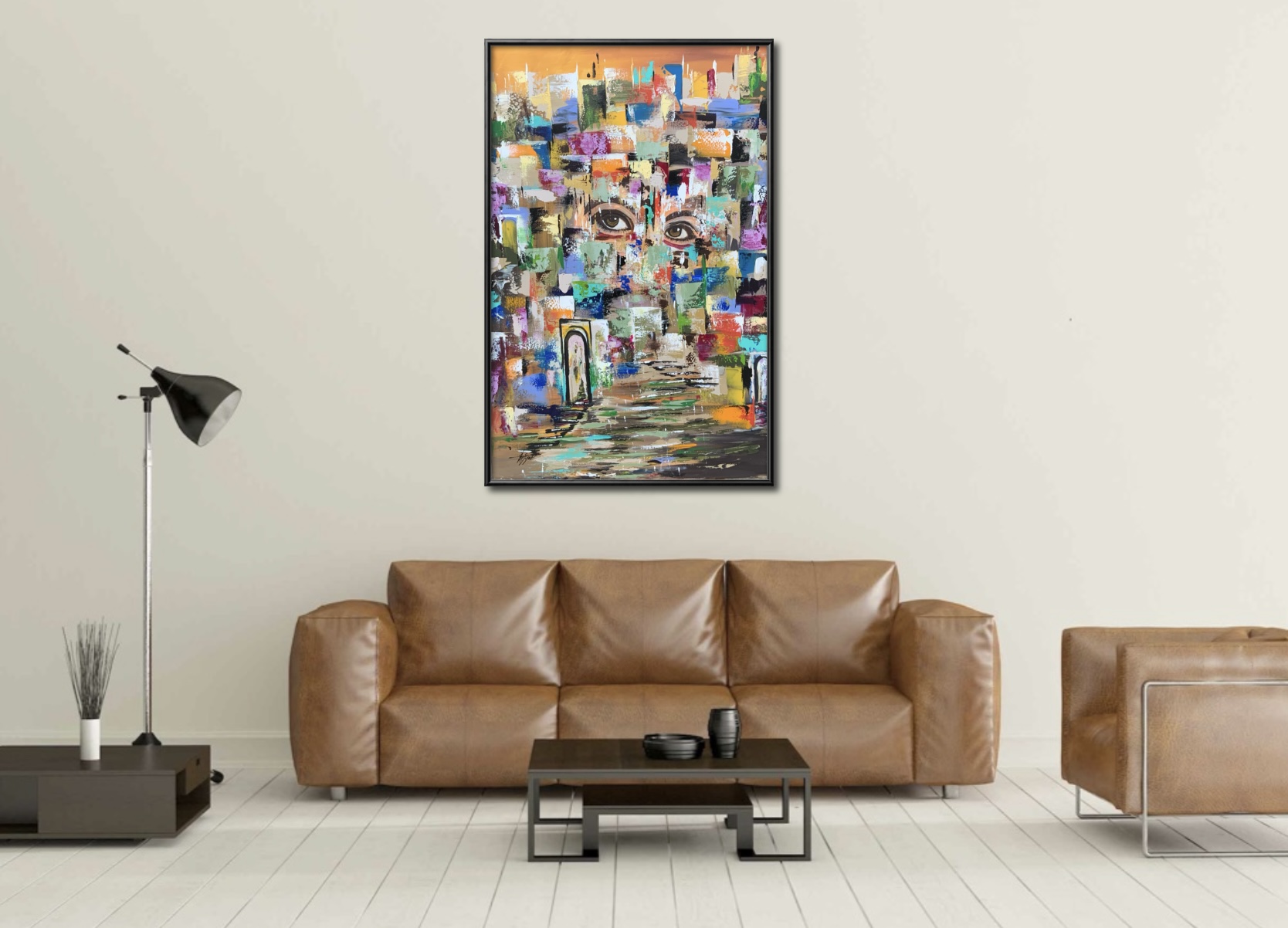 This painting portrays a poetic fusion between the human face and the urban landscape, where facial features dissolve into vibrant layers of color, as if the city itself embodies memory and identity. The eyes, placed at the heart of the composition, observe silently, carrying unspoken stories, while the layered colors reflect the rhythm of life, transformation, and the constant search for self within expressive chaos.