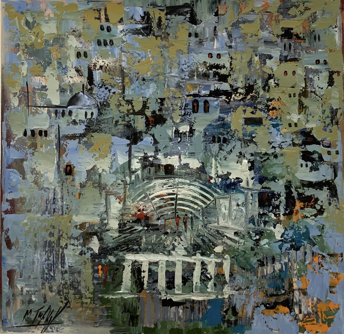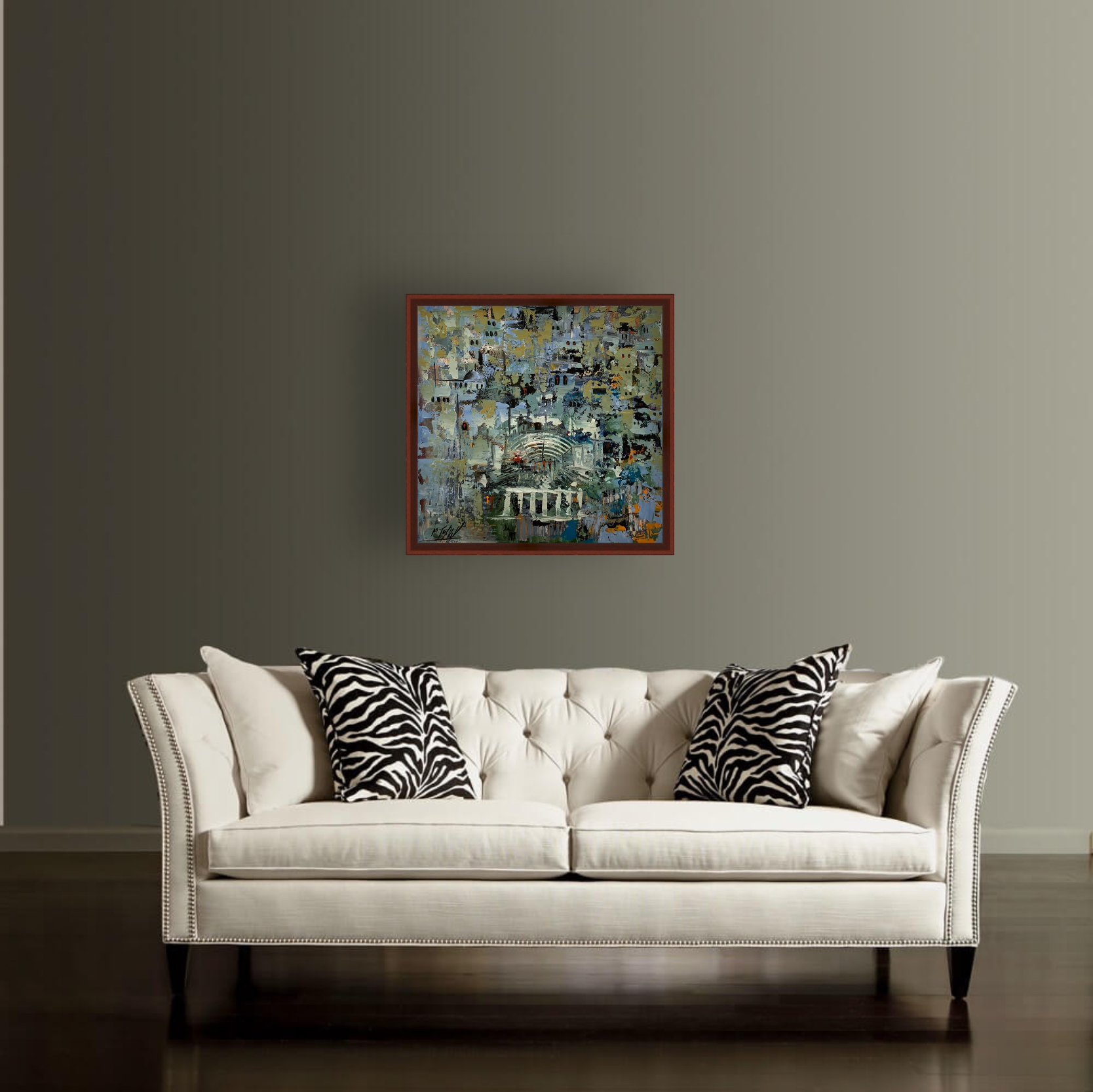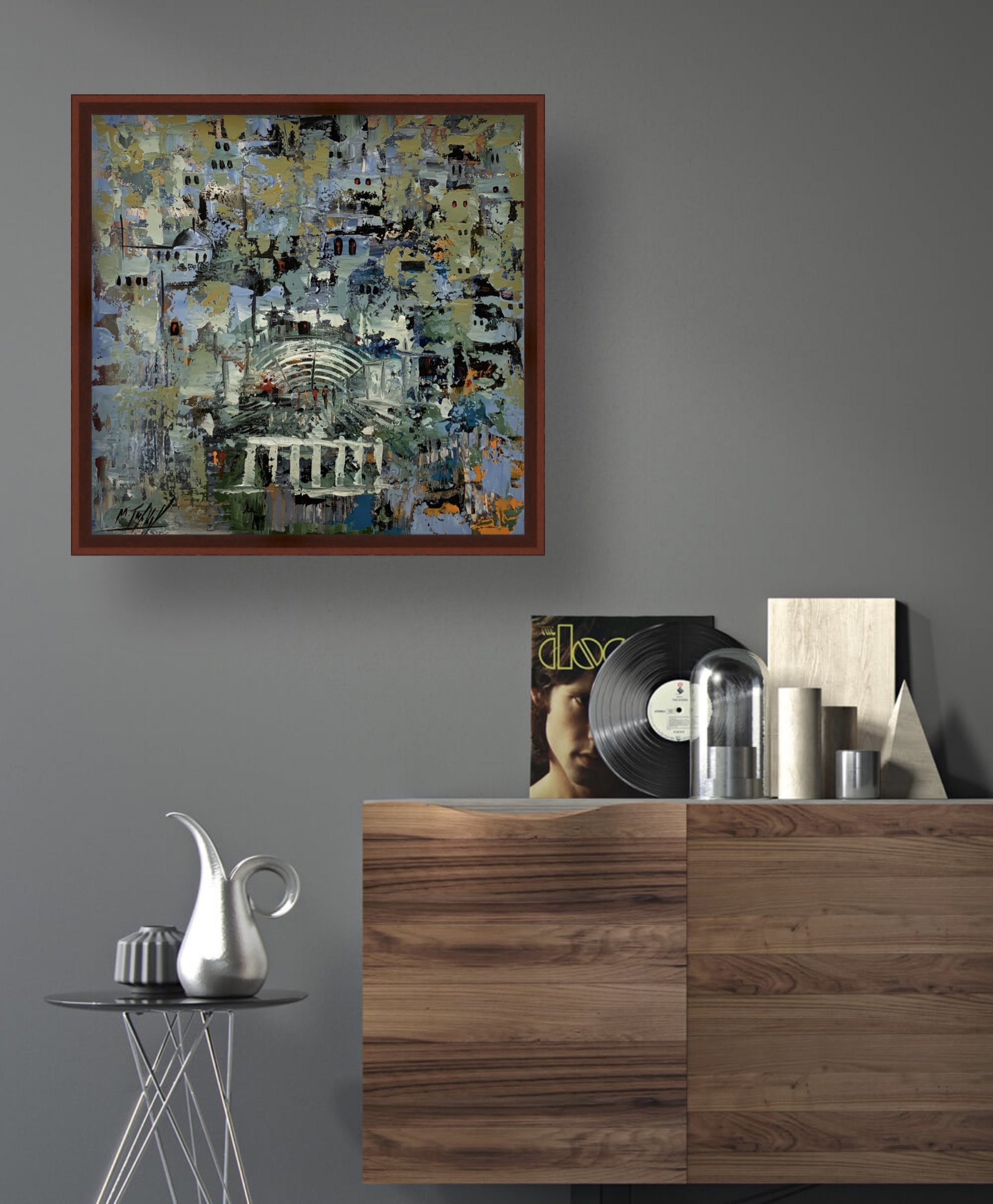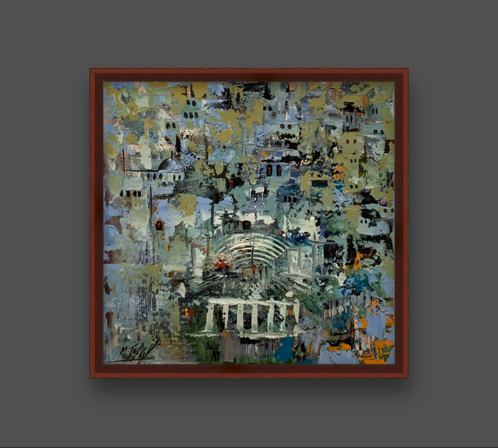 This painting captures the soul of historic Amman, with the Roman Theater standing proudly at its center — a timeless witness to ancient civilizations. Houses cascade along the surrounding hillsides in warm, harmonious tones, while the city’s streets pulse with life. It is a scene where history meets the present, and where the legacy of the past continues to inspire every gaze.