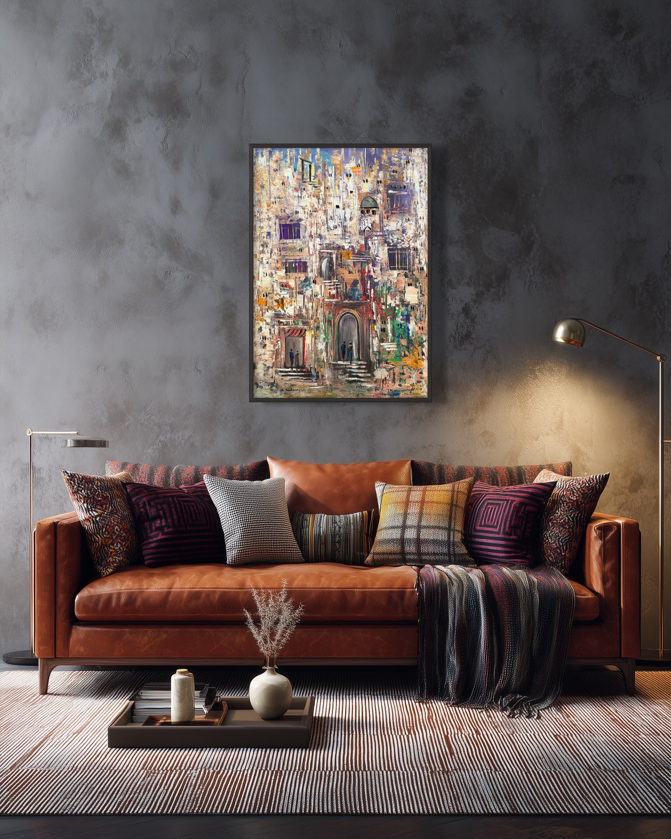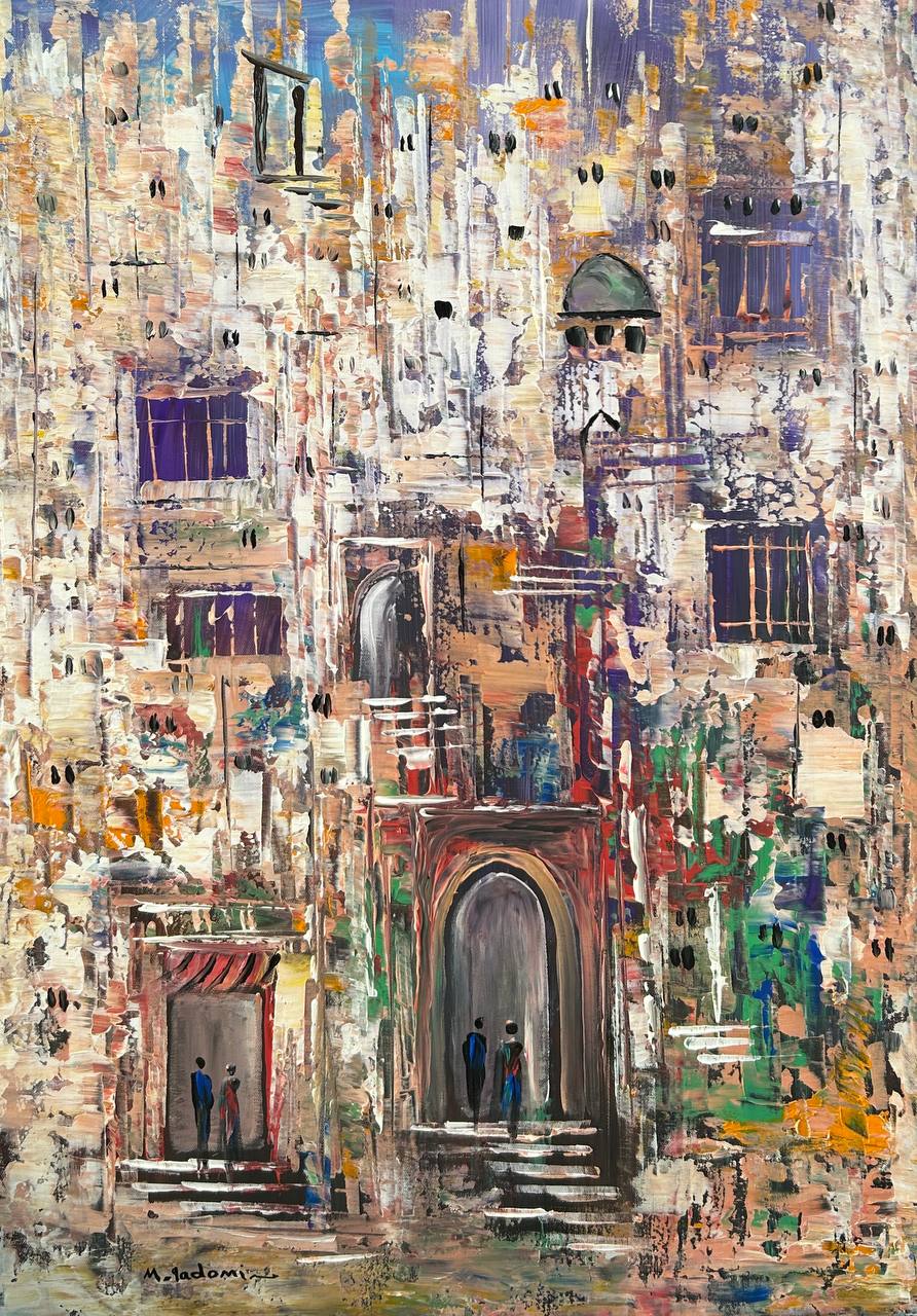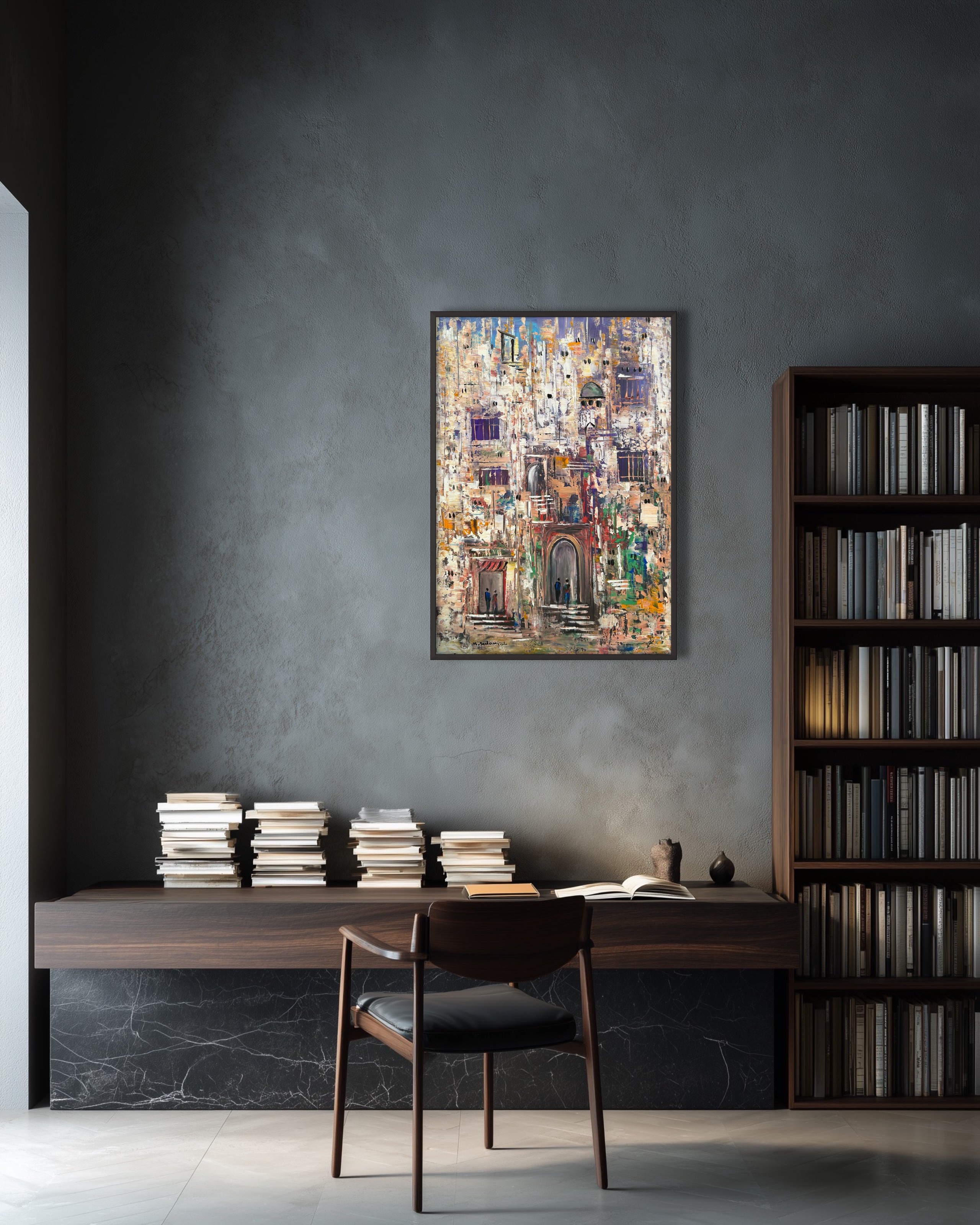 The painting depicts the façades of an old city dissolving into dense layers of color and texture, where doors become thresholds of silence and anticipation. Subtle human figures add a contemplative dimension, as if the city softly whispers its stories to those who linger.