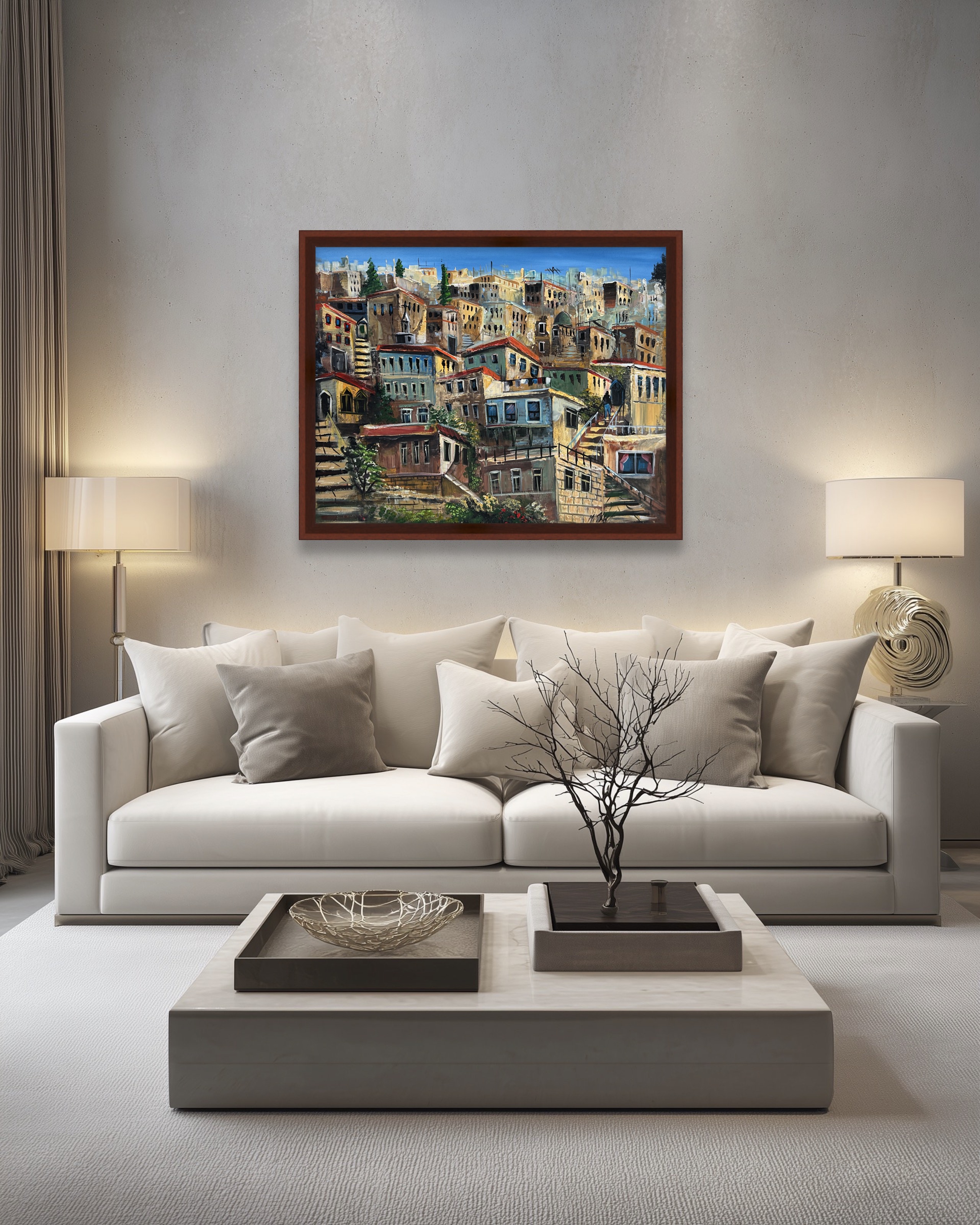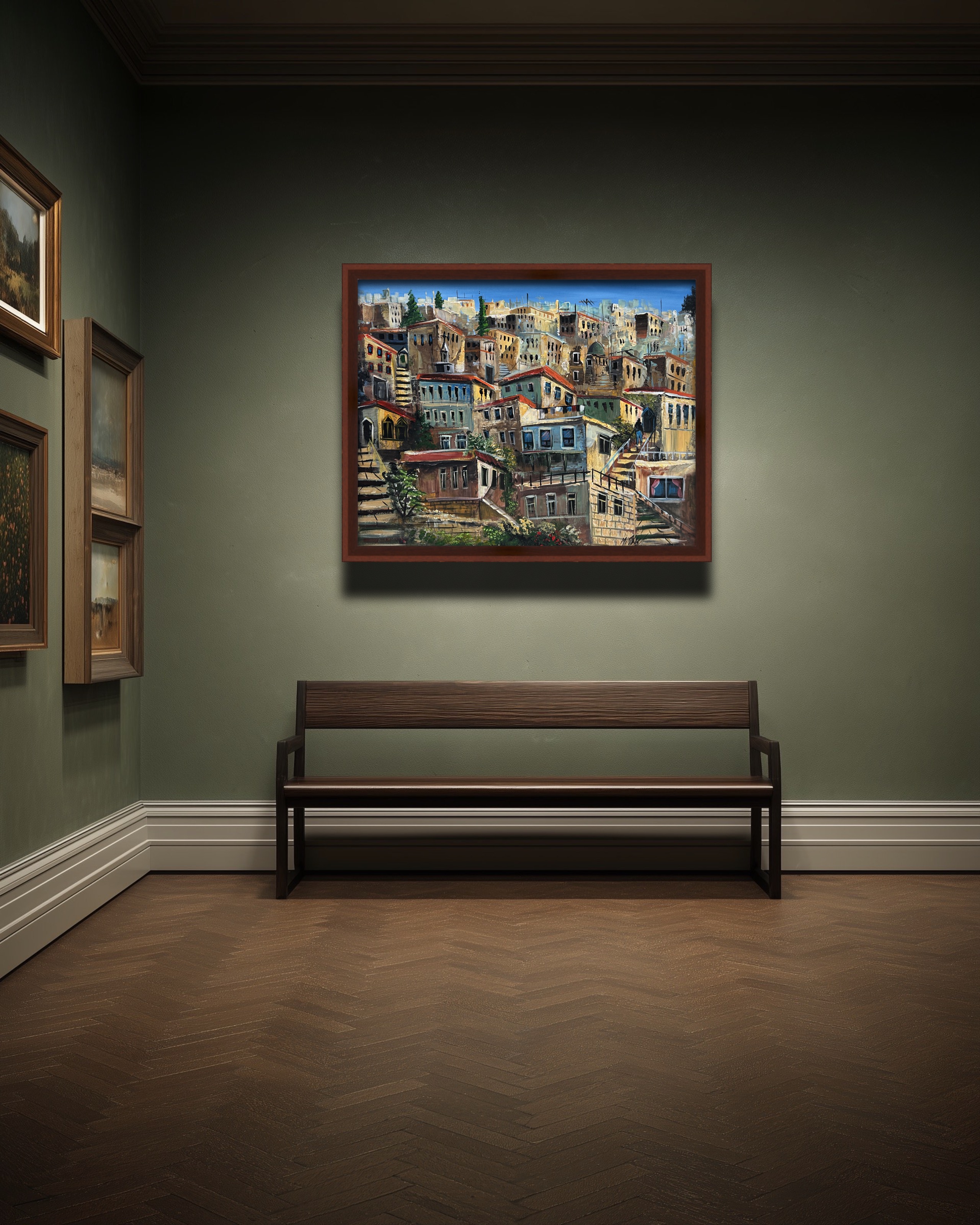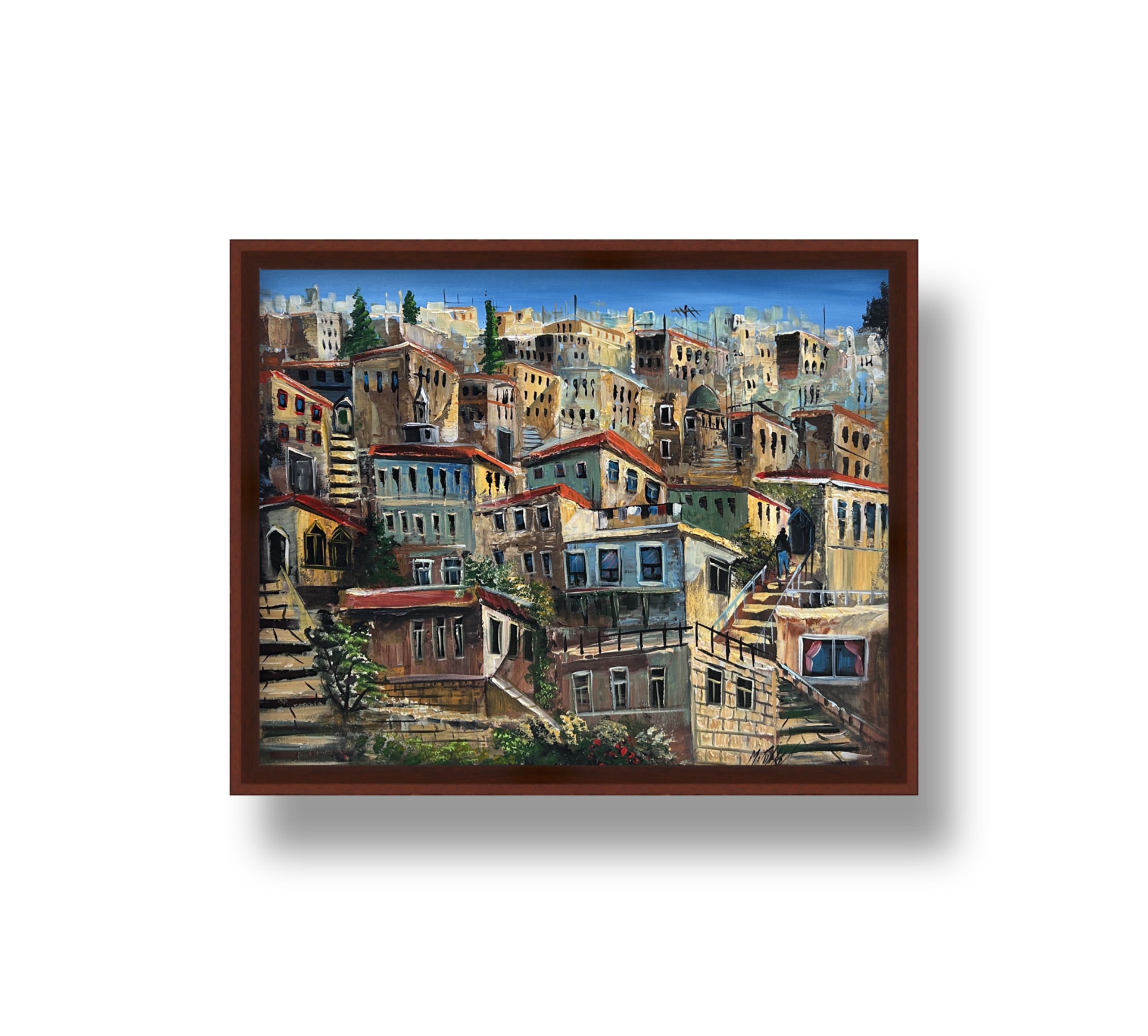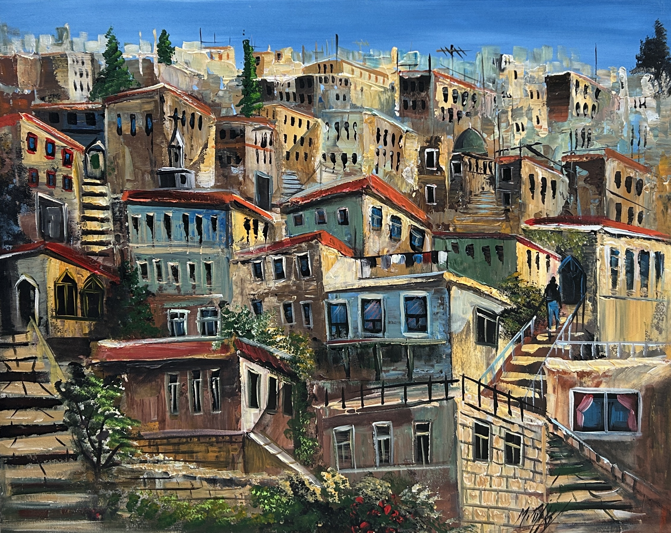 This painting depicts a layered city alive with movement, where stone houses and ascending stairways intertwine in a visual rhythm leading the eye upward. Scattered windows and doors suggest human presence and daily memory, while warm tones blended with blue skies create a balance between architectural solidity and gentle light. The artwork celebrates the city’s silent motion and the small journeys that shape meaning.