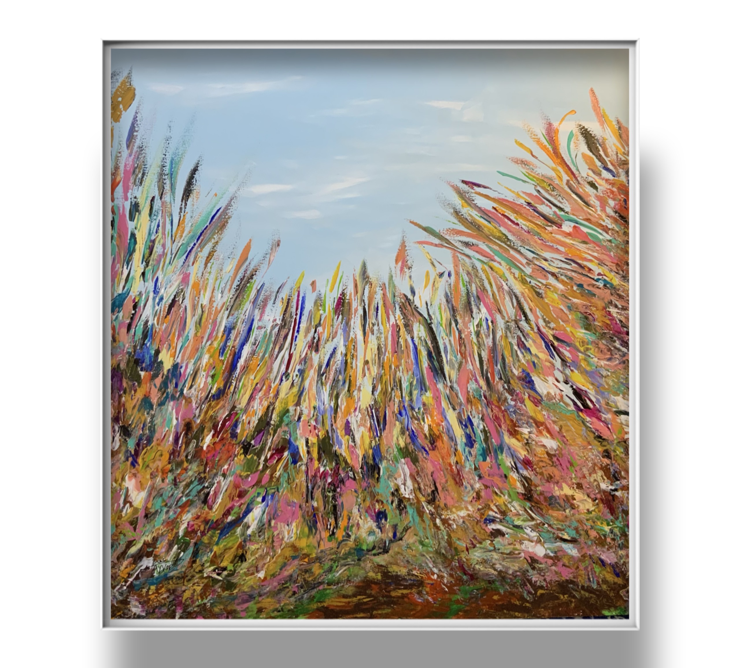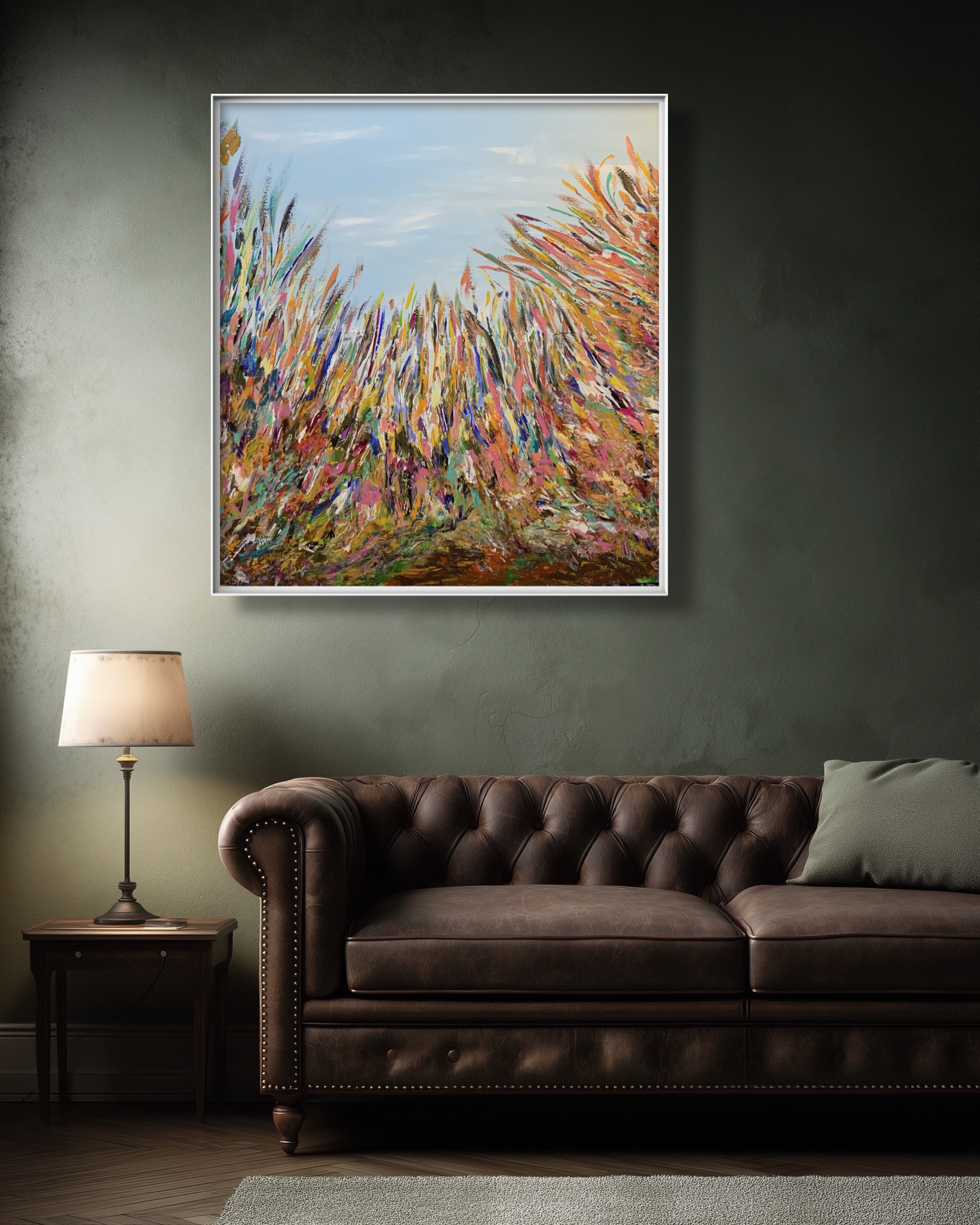 A vibrant abstract painting that evokes an imagined field swept by wind and emotion. Dynamic, layered brushstrokes create a visual rhythm suggesting growth and transformation, while the calm sky above offers balance and a space for quiet reflection.