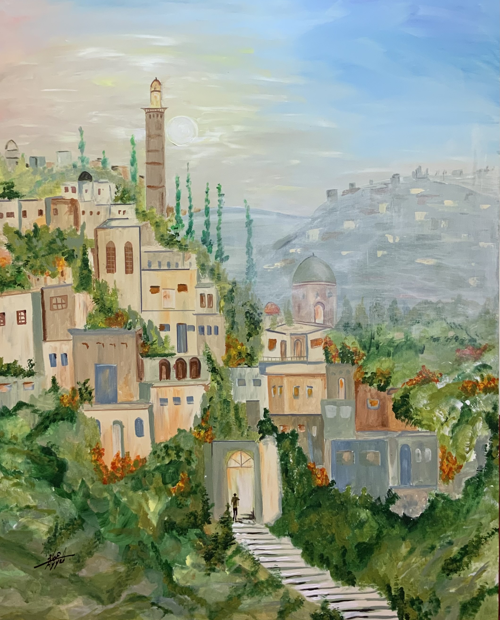 This painting portrays a tranquil city cascading over hills, where traditional architecture blends harmoniously with lush greenery. The minaret and dome add a spiritual dimension, while the stone pathway gently guides the viewer’s eye into the heart of the city, evoking a timeless journey through memory and place.