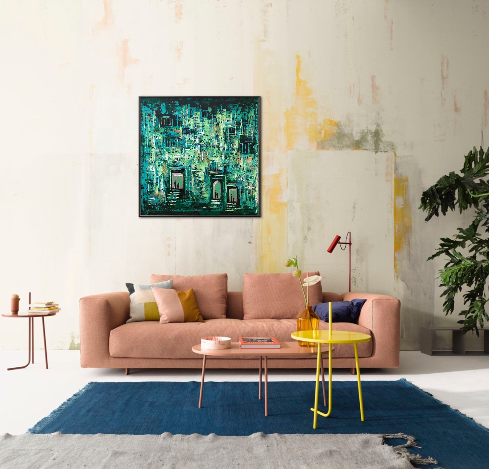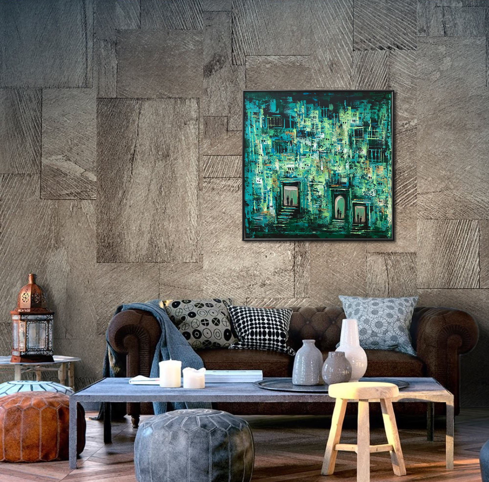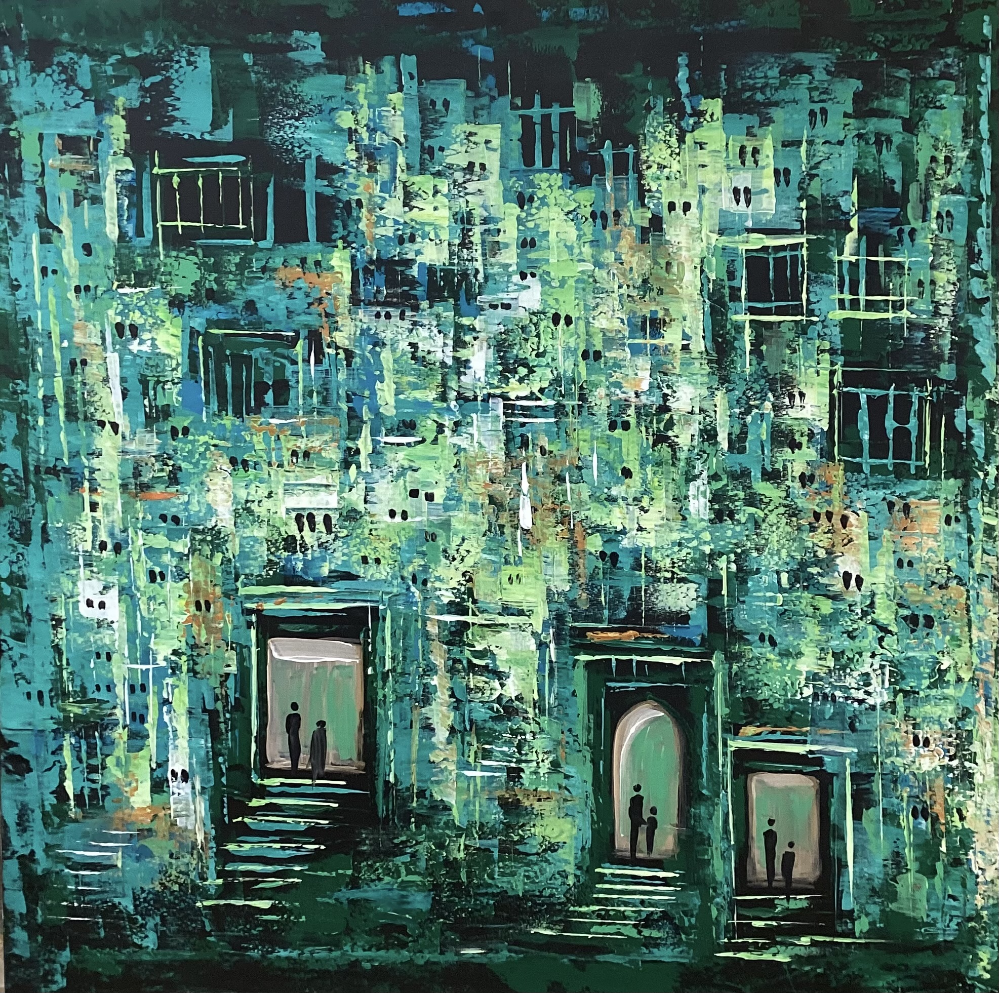 This painting transports viewers into an imagined city pulsating with life through shades of green and blue. Windows and doors scatter across the surface like the breathing rhythm of buildings, while silhouettes of figures at the entrances symbolize human presence within the dense urban maze. The layered colors, applied with energetic strokes, evoke the rhythm of daily life and the harmony between past and present in the heart of the city.