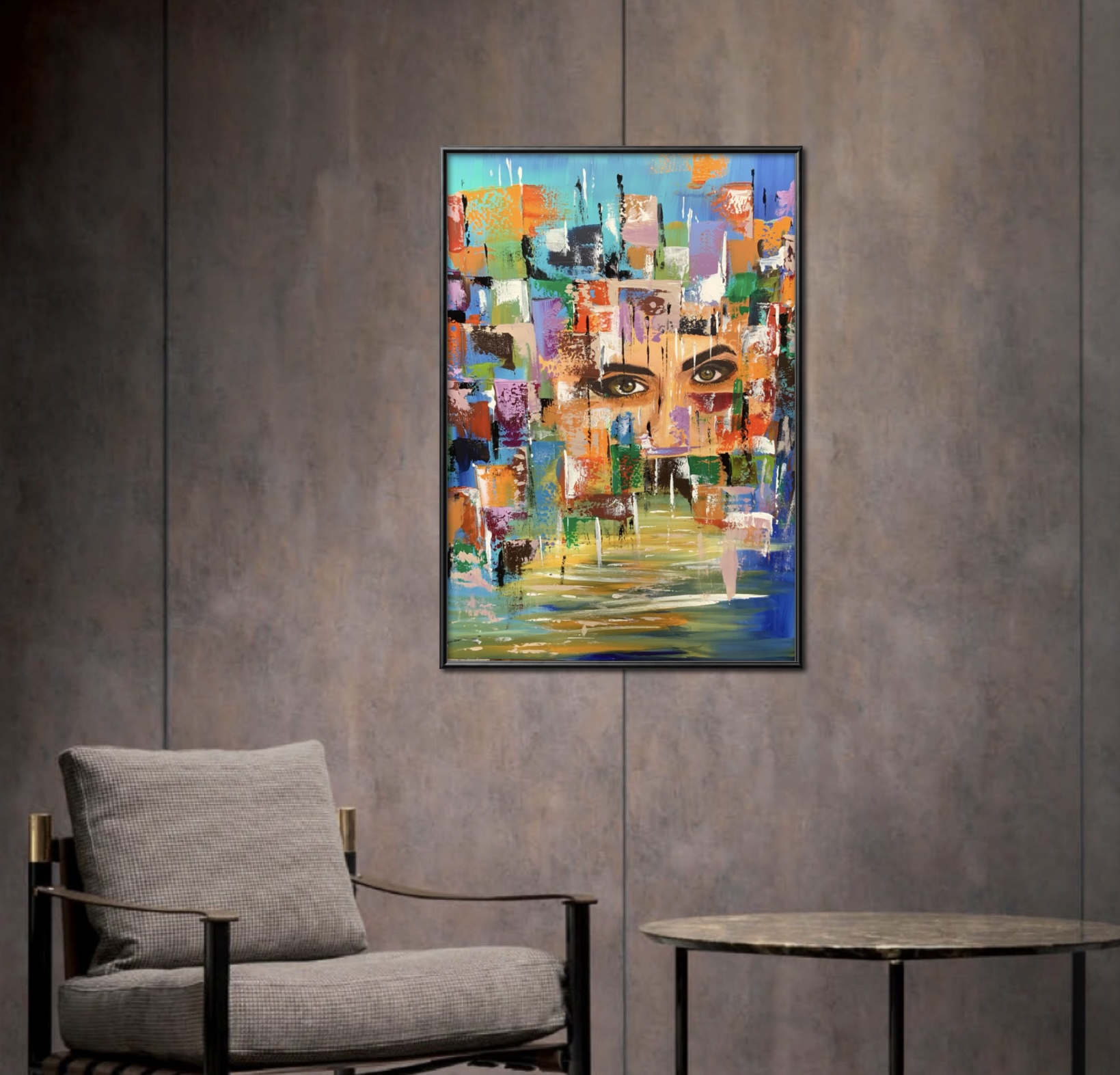 This artwork blends abstract expressionism with striking realism, creating a vivid composition where fragmented colors intersect with a partially revealed face. Only the eyes emerge clearly, acting as a window into hidden emotions amid a chaotic mosaic of hues. The piece evokes mystery and beauty as the boundaries between the human presence and the surrounding abstract world dissolve.